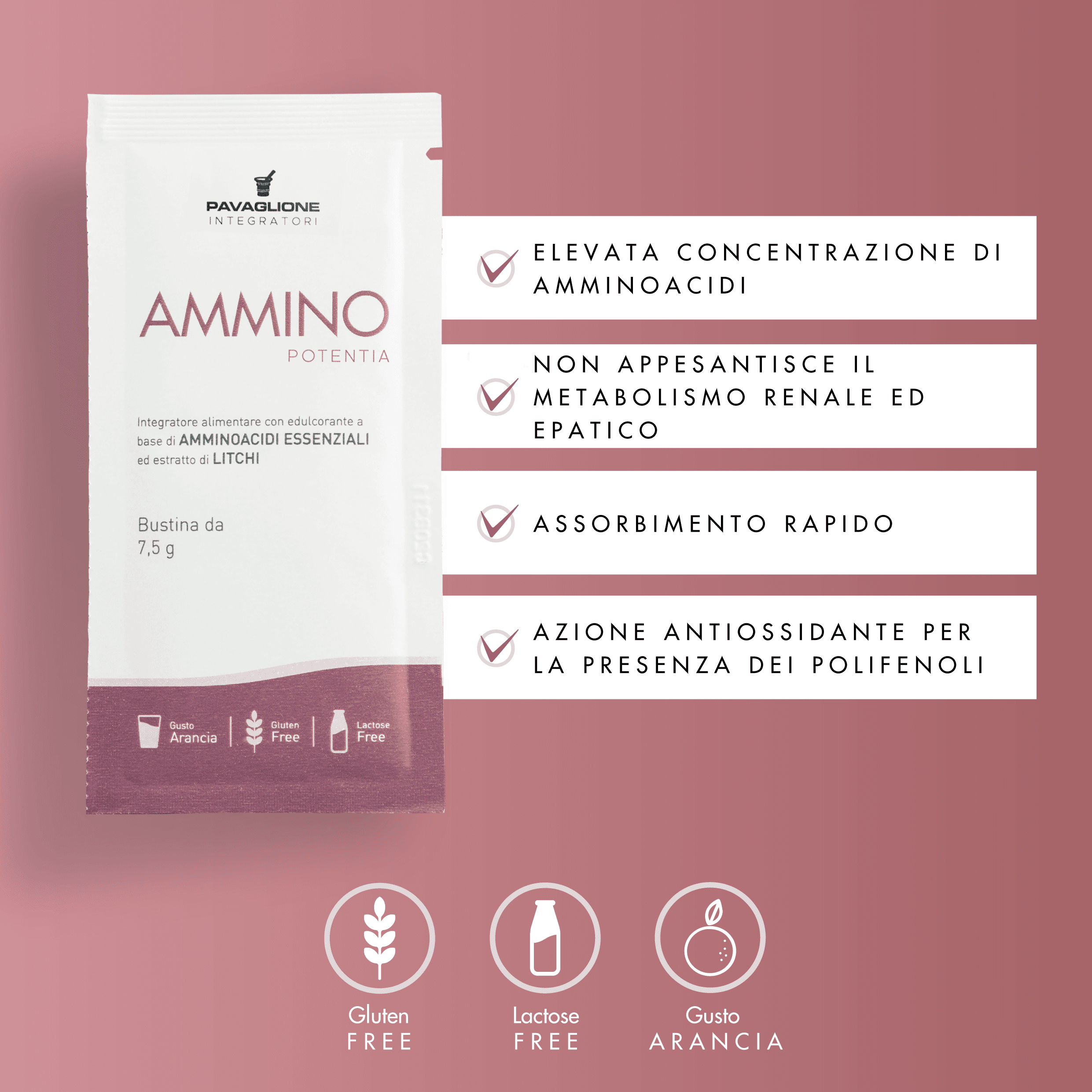 Ammino Potentia è un integratore alimentare a base di amminoacidi essenziali ed estratto di Litchi e Olivo. Gli Amminoacidi sono considerati i “mattoni” della struttura proteica e sono fondamentali per il funzionamento dell’organismo. Tra gli amminoacidi, 8 sono definiti essenziali perché il nostro corpo non è in grado di sintetizzarli e devono essere integrati.