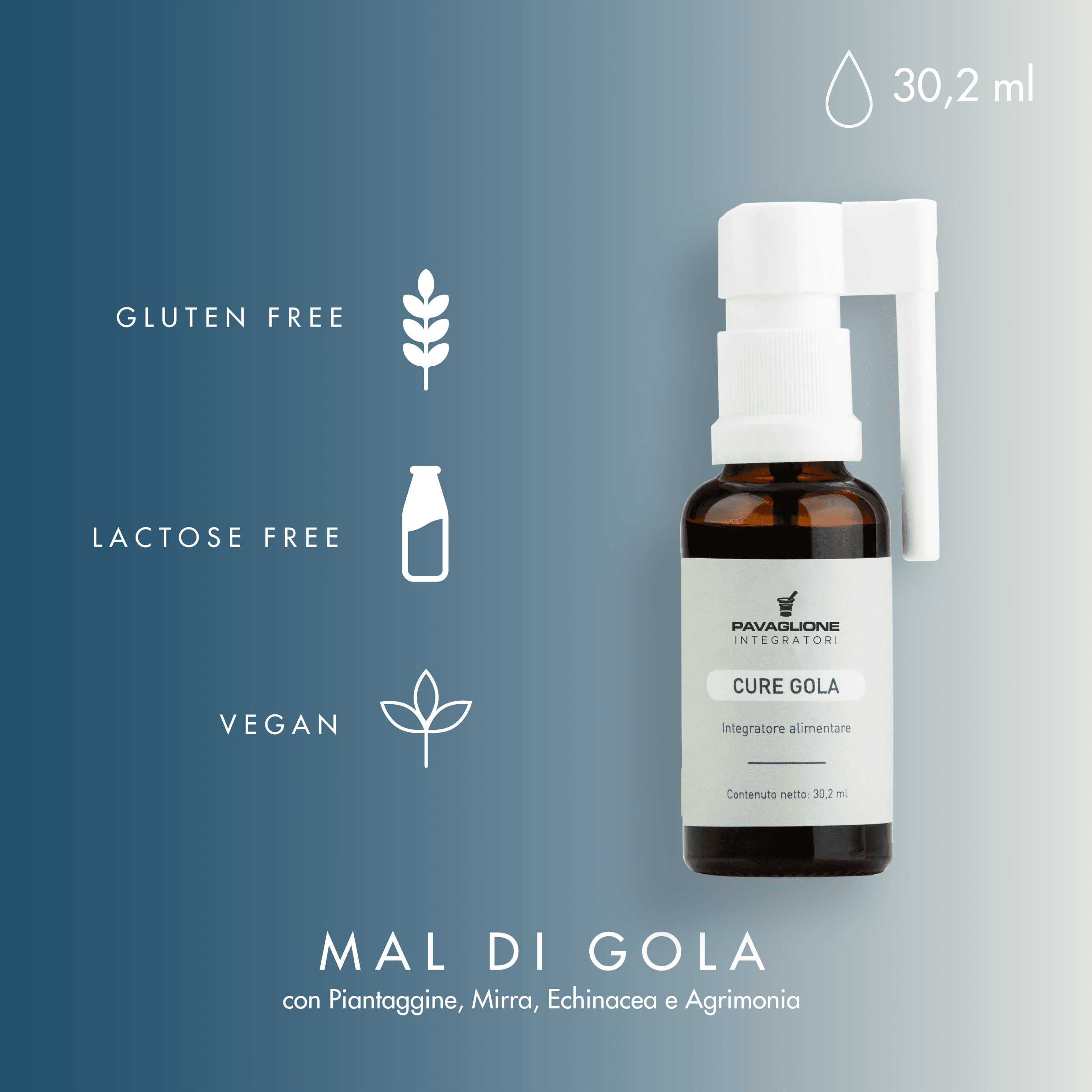 Cure Gola è un integratore alimentare in spray a base di estratti vegetali utili per favorire il benessere del cavo orale e donare sollievo alla gola.