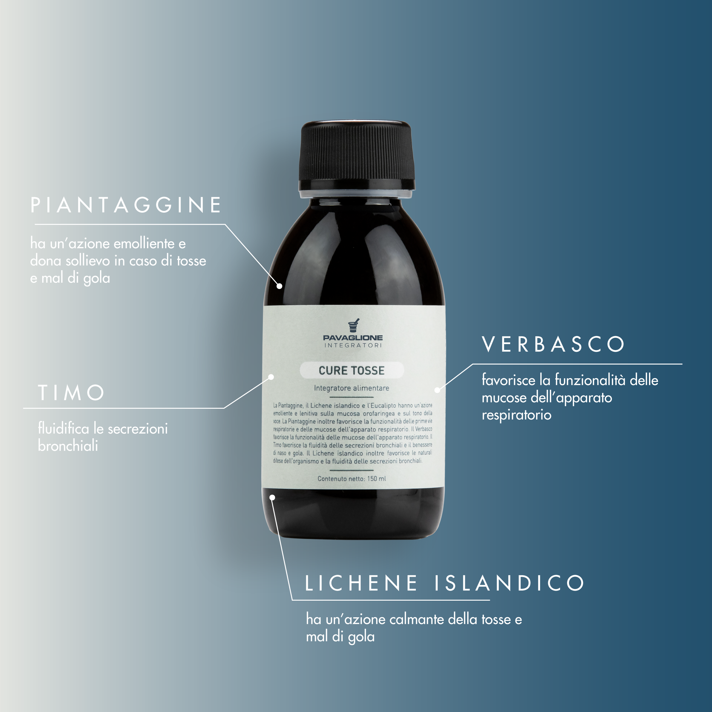 Il Lichene Islandico, la Piantaggine e l’estratto di fiori di Verbasco favoriscono il benessere delle prime vie respiratorie e la fluidità delle secrezioni bronchiali. L’azione sinergica è utile in caso di tosse secca, tosse grassa e catarro.