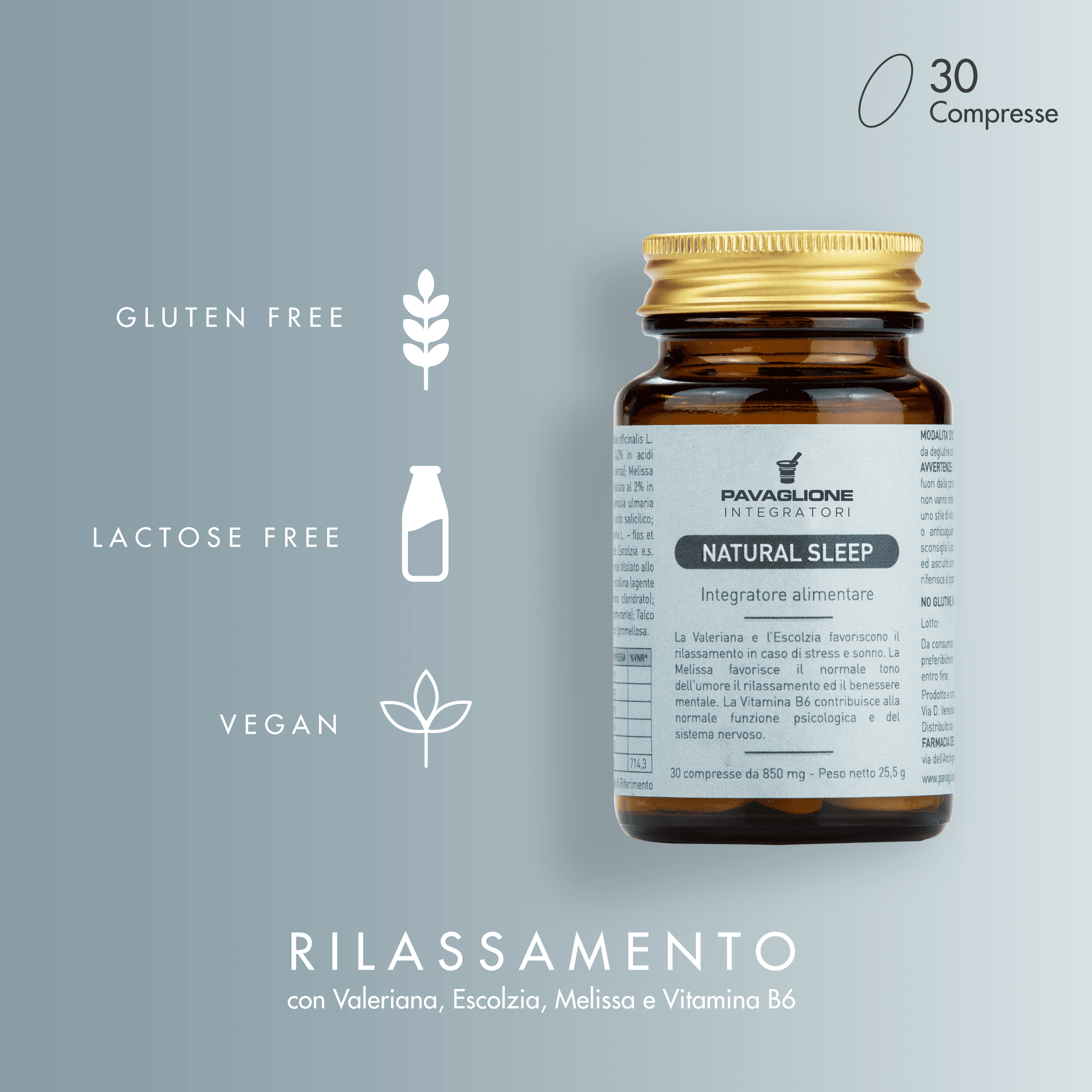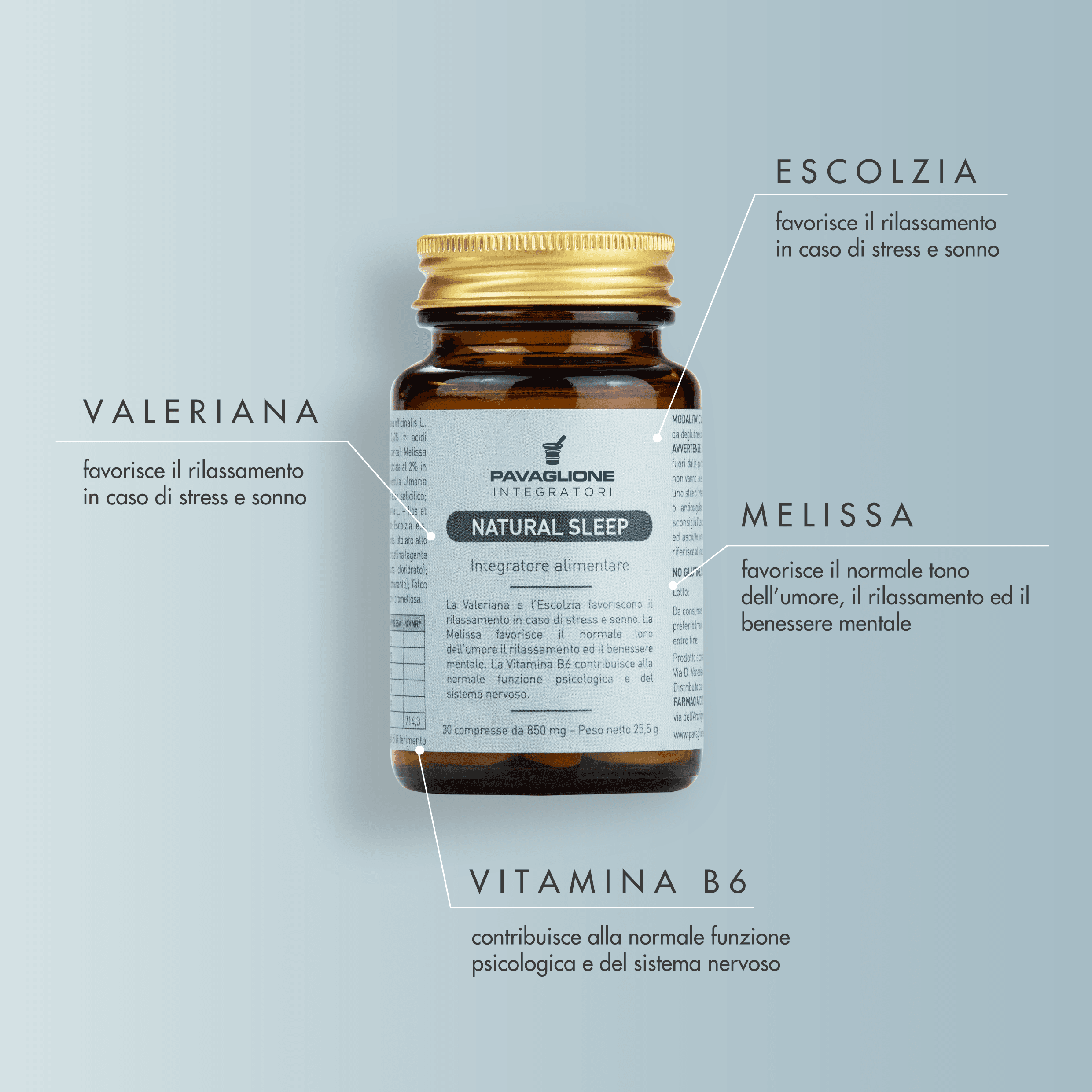 Gli ingredienti selezionati e uniti con attenzione per la loro efficacia, creano un effetto benefico sul corpo e sulla mente. Natural Sleep consente al corpo di abbracciare un sonno naturale e tranquillo.